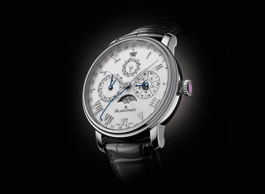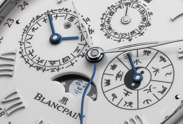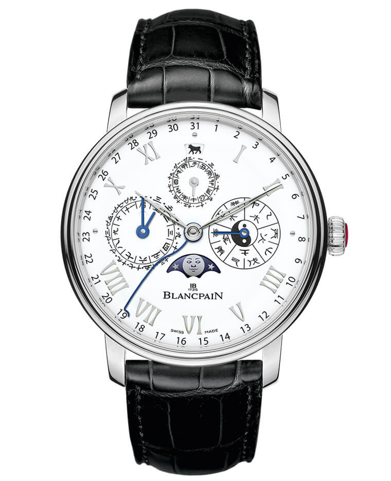 寶珀在2012年別開生面推出了Villeret中華年曆錶,特色在於品牌試圖在變化起伏較大的陰陽曆法週期中,歸納出可融入機械運作體系的顯時功用。中華年曆錶的面盤蘊含中、西曆並陳的豐富走時性,包括外圈有西曆的時、分與日期顯示;內側的三個錶盤分別是12點方向每年生肖圖騰視窗,加上以12地支表示的兩小時顯時盤、3點方向則有10個天干與五行元素合組的十年週期盤、9點位置為具閏月指示的農曆月份與日期顯示。配合Villeret系列在全日曆款常見的6點扇形月相窗,除了突顯特色,亦與農曆倚重月相週期的本質息息相關。