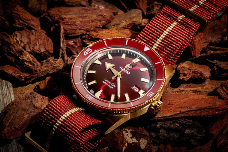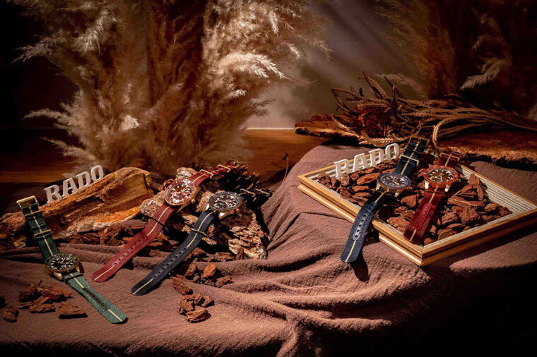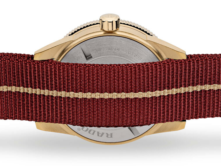 庫克船長青銅手錶皆具有錶帶快拆設計,而品牌新推出的青銅專屬NATO錶帶以香檳金色線條及同色青銅錶扣搭配藉以呈現整體風格。青銅版本的庫克船長300米自動錶不管鋼鐵紅、咖啡、海洋藍或叢林綠色皆在全台雷達表專賣店獨賣。