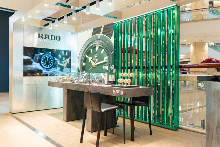 RADO雷達表全球首創概念店降臨台北101,近日正式改裝開幕,品牌改以白色簡約結構與開放式空間設計營造清新風格,再以綠色與帶有岩紋的展示桌來點綴整體空間。雷達表概念店更設有錶款體驗區拉近與消費者的距離,並體現出品牌在材質及設計領域的專長。