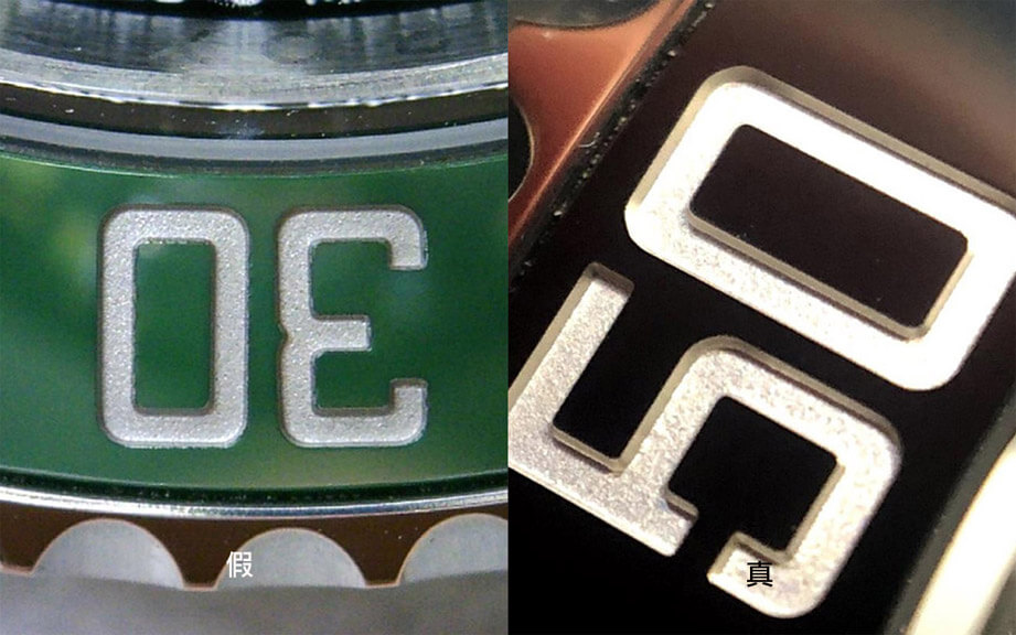 正品面盤字體較肥胖圓潤,仿品字體比較纖細,此鑑定點一般在看時建議一旁有正品能做比對。