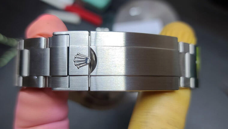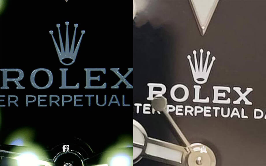 正品錶扣內的ROLEXSA刻字較深也較俐落,雷射頭口徑較細,刻字較整齊;相比仿品刻字清晰度不足,且A字體頭部真品為平頭,仿品為尖頭。