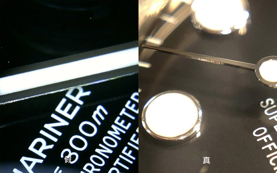 正品指針側邊皆有進行輕微的研磨,可以清出看見製成的條紋,而仿品指針側邊可以看見非常雜亂,且與平面交界的部分有輕微的毛邊。當然,正品指針在正面與側邊之間很清楚是沒有毛邊且非常俐落。
