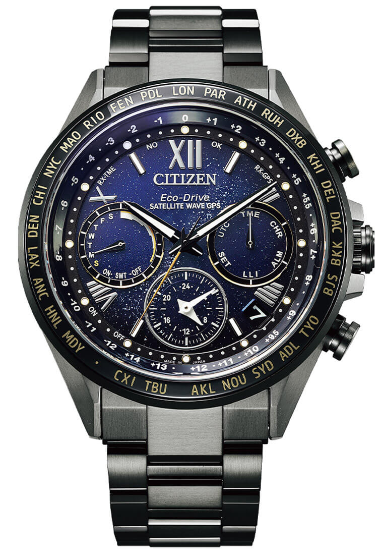 ▲CC4015-86L具有萬年曆、計時、鬧鈴、GPS定位對時和衛星對時等強大功能。 星空藍光動能GPS衛星對時款CC4015-86L搭載光動能GPS衛星對時機芯F950,佩戴者能在前往世界39個時區都時輕易調整時間,萬年曆功能讓佩戴者可以享受手錶提供最正確的時間及日期資訊。星空藍面盤由雙球面防眩光藍寶石玻璃鏡面籠罩,所有的指針、三眼小錶盤功能及金色刻度,看起來就像是星體環繞軌道運行在深邃無垠的銀河中。