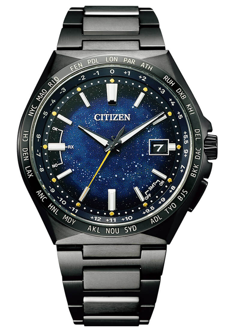 ▲CITIZEN把光與時間誕生概念融入全新手錶的設計中,以星空藍成為手錶共同元素。 至於CITIZEN主力的光動能全球多局電波對時手錶此番也換上星空藍色彩,光動能全球多局電波男錶CB0219-50L面盤透過神祕星空藍暈染,搭配不同大小的裝飾圓點,詮釋遨遊宇宙的畫面。