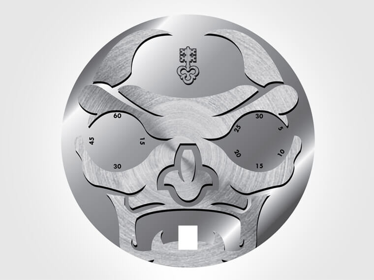 而手錶的計時功能也巧妙融入面盤的設計中,例如妖怪面具6點方向的獠牙中間開設有一個舉行窗口,那其實帶有日期盤的功能,至於妖怪面具的雙眼分別以右眼代表分鐘計時盤、左眼代表小秒盤,兩枚小錶盤分別放上了紅色的飛鏢造型(其中一枚針尖塗黑以指示時間),一來具有實質作用,同時又能呼應武士文化,同時紅色指針灰色背景映襯下也相對清晰。