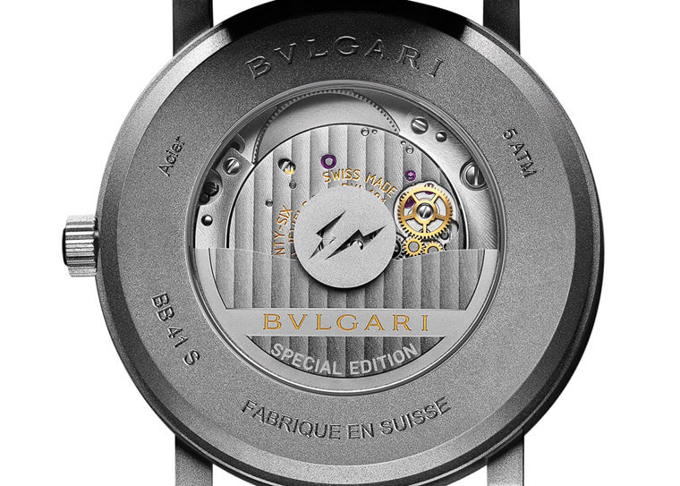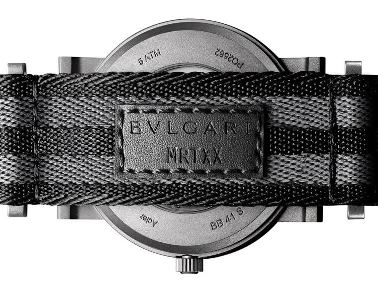 先來看看SAP103443和一般BVLGARI BVLGARI手錶的差別,前者採用噴砂不鏽鋼錶殼,錶徑一樣是41mm並且搭載BVL 191機芯,不過錶圈原本上下兩個”BVLGARI”字樣如今下方被“FRGMT”字樣取代,同時手錶的黑色面盤也移除了時標等零件,另外面盤12點方向則是加上寶格麗和FRGMT字樣,6點方向亦放上了Fragment Design的閃電Logo。還有一個特別之處在於錶帶,一般版的BVLGARI BVLGARI手錶往往搭配皮錶帶或橡膠錶帶,但是SAP103443卻很新奇地換上NATO錶帶,這讓手錶的休閒運動風格更為強烈。而在錶冠頂部和透明底蓋上也都看得到閃電標誌,透過這些小細節賦予手錶獨特個性。