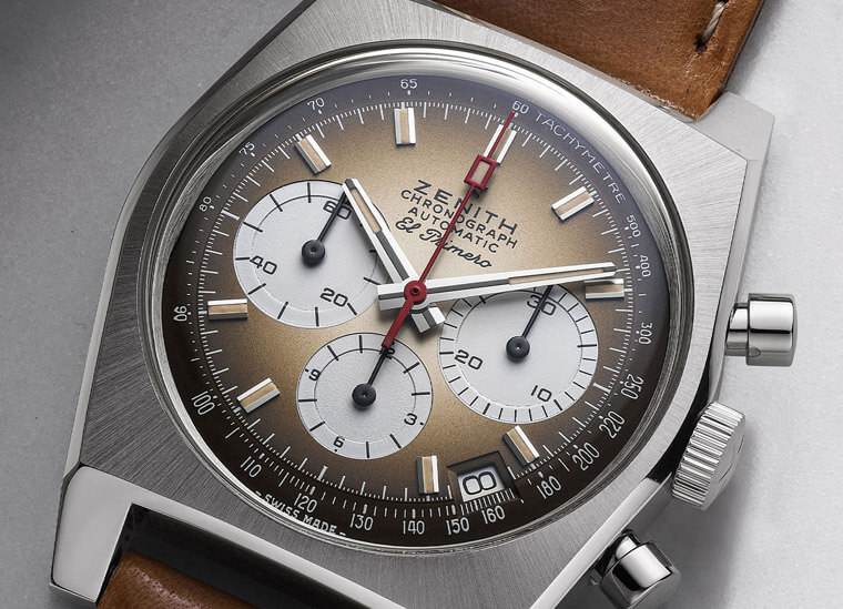 原款的A385有個特色在於棕色漸層面盤,隨著歲月累積更突顯出這種面盤的特別感,真力時為了盡力呈現手錶原始的樣貌,因此復刻版同樣採用了同色調的漸層面盤,就連紅色的中央計時秒針也是比照原款辦理,同時品牌連時標上的夜光塗料也採用帶有復古況味的米黃色,這些細節強化了手錶的懷舊氛圍。