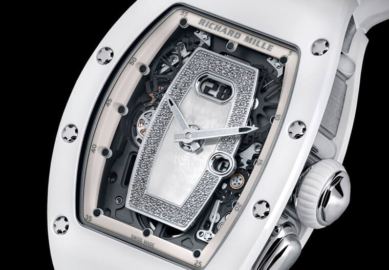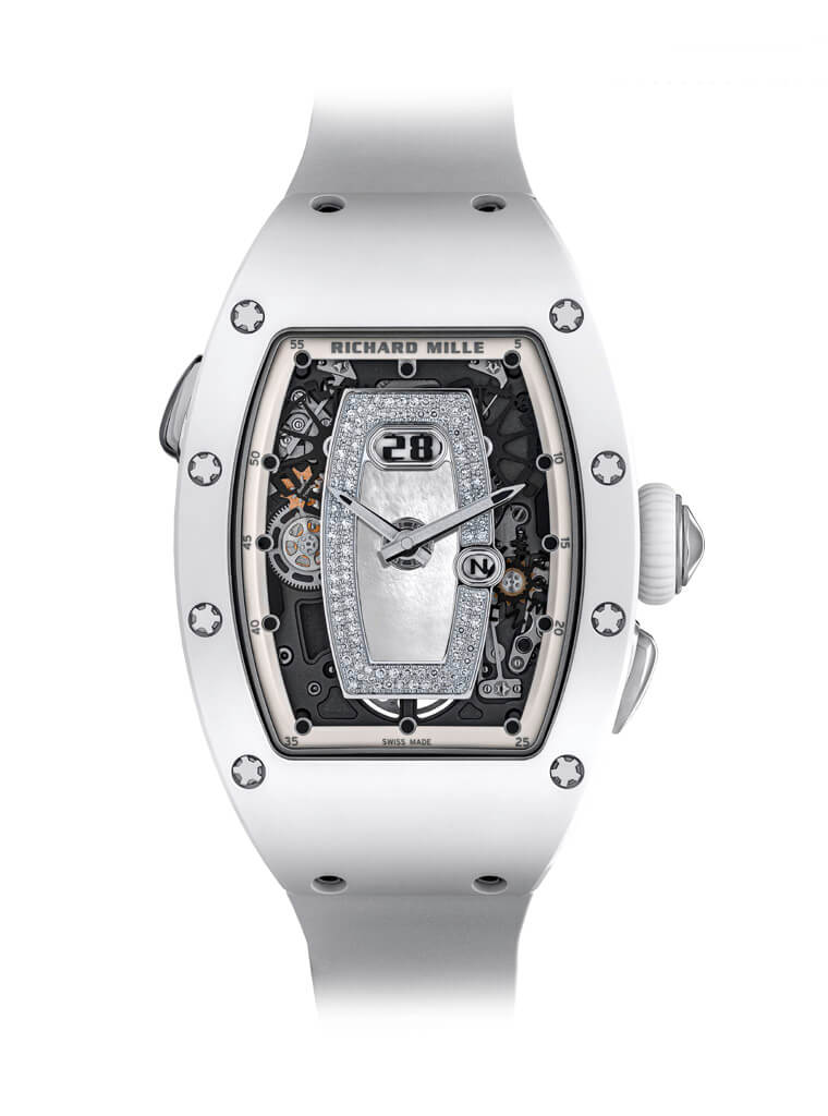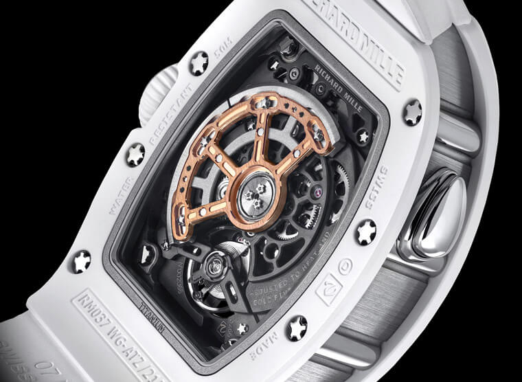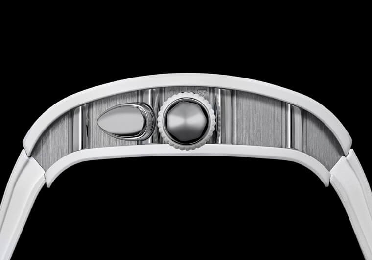 品牌此次用以製作錶殼的陶瓷為白色ATZ陶瓷,包括錶圈甚至底蓋邊緣都以此種材質製成,ATZ陶瓷是世上硬度僅次於鑽石的材料之一,製作過程必需在2,000巴的高壓下注射氧化鋁粉末成型,如此可使其硬度增加百分之20到30,並讓材料的孔隙率降到最低,RICHARD MILLE採用ATZ陶瓷製作錶殼的目的非常明確,因為它既耐刮耐磨,同時色澤也可以常保如新,對於佩戴時的保護性以及觀賞性都有正面效應。