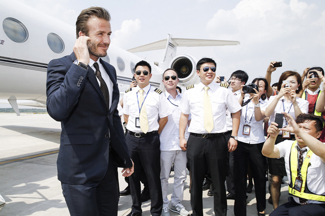 ▲ 百年靈全球形象代言人大衛.貝克漢抵達北京,腕間佩戴:百年靈越洋世界時間計時手錶紅金版(Transocean Chronograph Unitime Red Gold)。