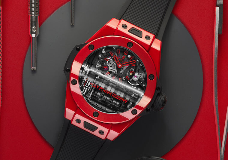 ▲Big Bang MP-11魔力紅陶瓷手錶搭載結構特殊又複雜的HUB9011機芯,其具有7個串連的滾筒式發條盒,形成特殊的視覺效果。