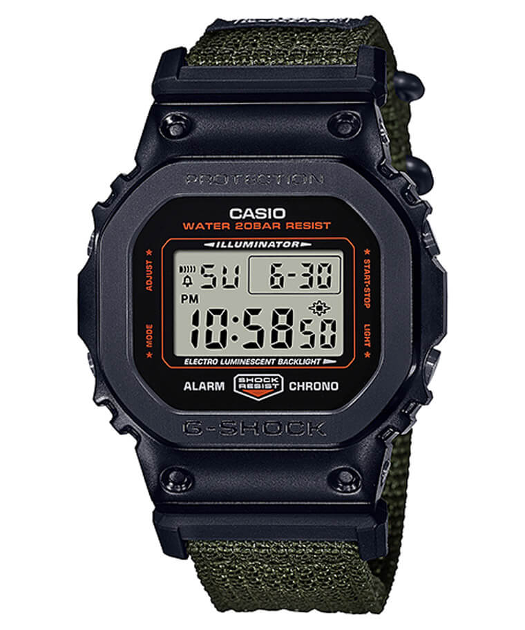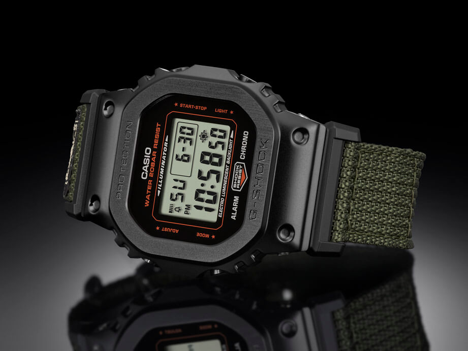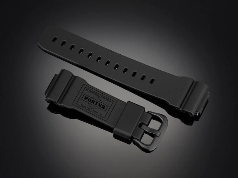 由於是和擅長製作包款的品牌聯名,可想而知GM-5600EY-1的錶帶會是一個重點,G-SHOCK和YOSHIDA PORTER選用後者經典的綠色帆布製作錶帶並縫上PORTER包上的布標,此外G-SHOCK還會隨著錶盒放上另一條黑色樹脂錶帶以供錶主替換,樹脂錶帶雖然相對低調,但它的表面也還特別印上黑字的PORTER商標傳達聯名意義。