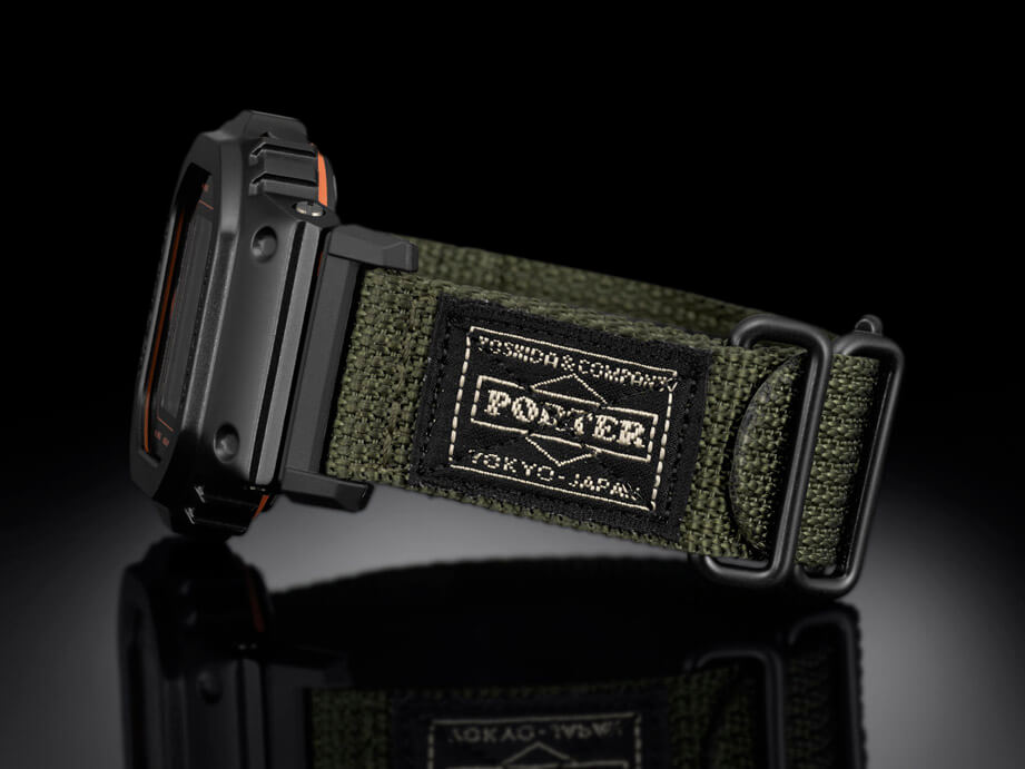 ▲G-SHOCK以PORTER包常見的綠色帆布製作錶帶,並在上頭縫上PORTER包布標。
