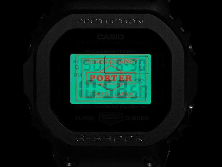 GM-5600EY-1以G-SHOCK人氣系列GM-5600為基礎,它的錶殼為鍍成黑色的不鏽鋼,質感比起一般樹脂錶殼的G-SHOCK更吸引人,至於手錶的液晶顯示螢幕可以顯示基本的時間資訊外,也還有計時碼錶、倒數計時、鬧鈴等豐富功能。同時黑色邊框的面盤也融入能代表YOSHIDA PORTER的橘色細節,突顯雙方聯名的珍貴意義。此外當佩戴者按下冷光燈,螢幕上還會浮現YOSHIDA & COMPANY與PORTER Logo,隱含的設計巧思讓人發出會心一笑。