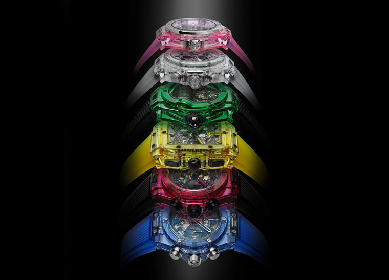 宇舶之所以能在短時間能成為錶壇製作透明殼的專家,與他們不斷替透明殼增添新元素有關,以往講到透明殼,我們只會想到無色透明的樣式,然而宇舶自從推出無色透明殼之後,接著又開發出了打破傳統印象的黑色透明錶殼,後來藍色透明、紅色透明、黃色透明,再到2022年最新的紫色透明錶殼相繼問世,堪稱重新定義了透明錶殼。