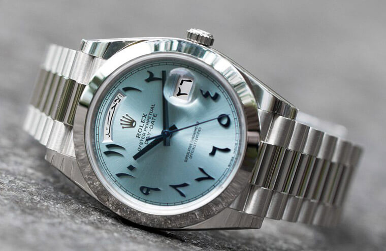不過對於錶櫃裡擁有許多驚人收藏的Jay-Z來說,這些市售的冰藍面鉑金Day-Date對他來說還不夠特別、不夠有吸引力,因此他收藏的這款其實算是地區限定版——那是勞力士專為中東市場所特製的版本,這種款式往往只有在中東特定的AD店才買得到,最主要的特色就在於手錶的時標、日期盤與星期盤字體統統改成了阿拉伯文字和數字,如果戴這款手錶目的是要閱讀時間,在不了解阿拉伯文的情況下可能只看得懂時標(畢竟方位是固定的,不需要認識阿拉伯文也看得懂,倒是日期和星期顯示就真的要先做點功課才行);但如果是想戴一款不容易撞錶的手錶,那麼這款錶的特殊性將能輕鬆達成目的,Jay-Z看不看得懂阿拉伯文我們不得而知,可是當他一亮出這款錶來,大家第一個感想通常都是:「哇!好特別」,而這或許才是Jay-Z當初入手這款錶的用意。