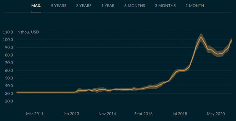 ▲5712/1A十年來的價格走勢,可以看出約從2016~2017年間,它的價格就一路上揚,至2020年新冠肺炎疫情期間曾短暫下跌,如今又繼續漲回高點。Source:Watchpro