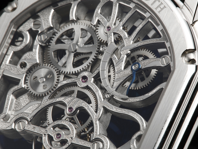 機芯鏤空的基板和錶橋以蛇行的曲線連接到機芯的外框,所有的夾板上都做了蛇行的紋路,其餘的部份則是鎏金表面處理,作工異常精緻。刻度圈是到這款才變成藍鋼的。
