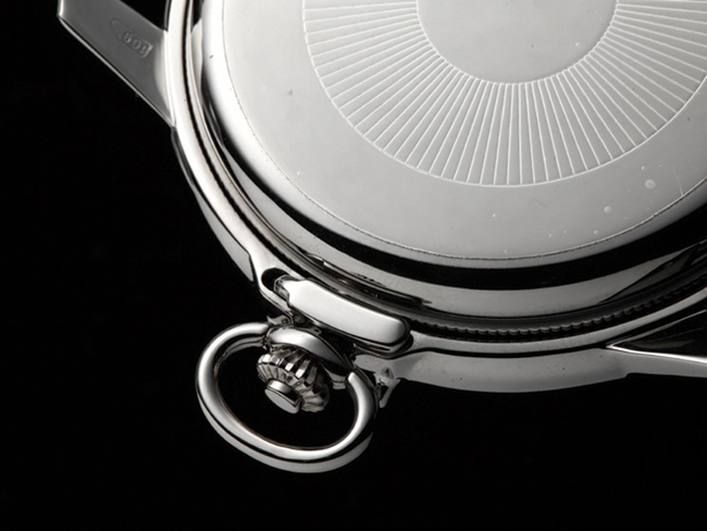 錶冠的基部有一扣鎖,只要扳開扣鎖便可以將錶身整個取出。從正面看錶冠兩邊有兩根突起的尖角,那是為了托住錶冠的吊環用的,只要將吊環撥到抵住尖角,從側面看就會呈現完全垂直。