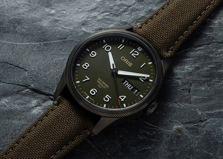 ORIS TLP限量錶採用槍灰色PVD不鏽鋼錶殼,錶帶以綠色Ventile®織物製成,這種材質起源自第二次世界大戰,當時瑞士有間廠商受到英國皇家空軍委託,因而打造出這種耐磨且能防風、防水的純棉織物,ORIS將之應用於製作錶帶,無論舒適度、耐用度都發揮令人滿意的效果。