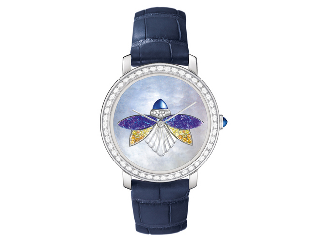 聖甲蟲被視為重生和保護的象徵,也被認為具永恆之愛的本質,因此常常被作為護身符佩戴。在古埃及,聖甲蟲是每天早晨黎明重生的太陽神。他被描繪成一個頭部配帶黃金聖甲蟲的男人,聖甲蟲彷如一個獎杯佇立向著太陽的方向。EPURE KHEPRI藝術系列 聖甲蟲手錶錶面使用珍珠母貝平面拼鑲,藍色和紫色漸層猶如黎明前夕的天空,輝映重生、純潔和希望的象徵。工匠運用質地對比、紋理和光線,將聖甲蟲的神祕魔力幻化成型。聖甲蟲頭部使用鮮豔的蛋面切割藍色剛玉,以及作為上翼的藍紫色蛋白石,和與刻有同心圓刻紋的水晶半透明身體,形成強烈的視覺對比;其頸部鑲嵌鑽石,象徵力量,而漸層色彩的黃色剛玉襯托下層翅膀的精緻,寶石火光和蛋白石的遊彩相互對比,為EPURE KHEPRI藝術系列 聖甲蟲手錶展現BOUCHERON的設計巧思。所有面盤上的寶石,皆以平面鑲嵌的技巧組合,透過中央的卡榫連結,不經過任何焊接或黏合,此項製作技法考驗工匠的精準手藝,更顯像BOUCHERON再製錶專業的高度要求。