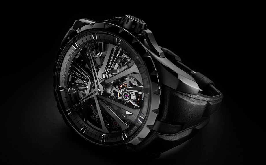 新款Excalibur Diabolus in Machina分別採用玫瑰金材質與DLC鈦合金材質製作錶殼,雖然前者2020年就曾經登場過,但是羅杰杜彼這次微調了手錶的面盤設計,例如面盤邊緣的刻度環與機芯機板都改鍍上深灰色,面盤下半部經過解構重組的星形橋板也鍍上一層黑色外觀,搭配羅馬數字時標鑲填的黑色SLN夜光塗料,塑造出另一番低調奢華的現代風格。