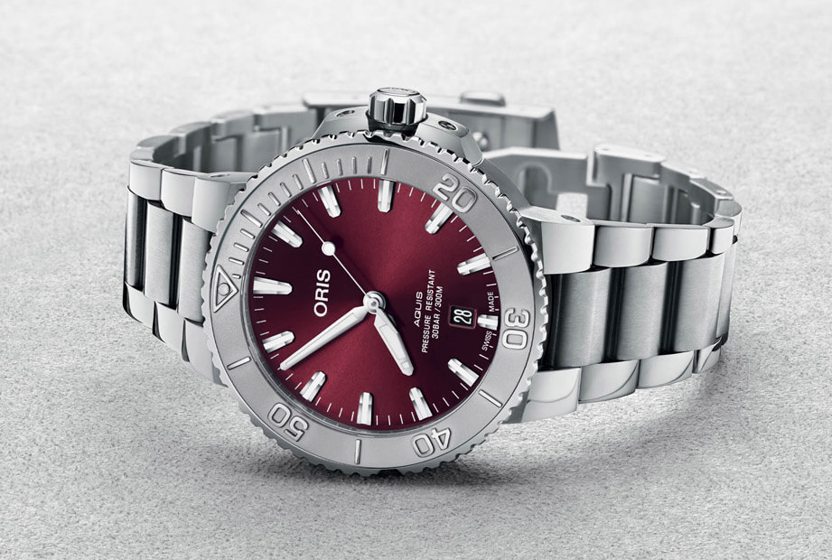 新款Aquis Date有透背可以窺看旗下的733自動機芯,機芯自動盤帶有ORIS特色的紅色塗裝,雖然這是品牌作品的共同特徵,但放在櫻桃紅面的手錶上,彷彿多了一種前後呼應的效果。機芯具有日期快調裝置與停秒裝置,平常調校時間可以調得更快速精準,而雖然手錶採用透明底蓋,但它依舊延續家族傳統保有300米的防水性能,加上錶冠護肩裝置等,佩戴到水下讓人更能感到安心。