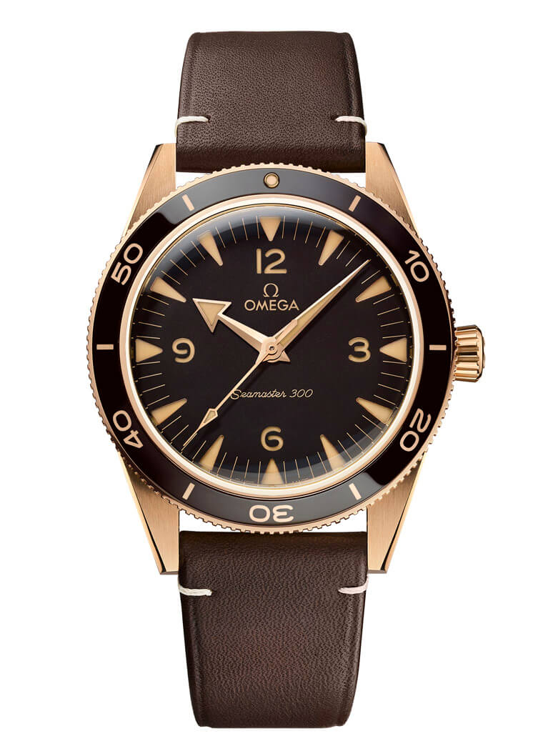 海馬300米青銅金手錶錶殼尺寸與不鏽鋼款同為41mm,除了錶殼之外,包括它皮錶帶搭配的錶帶也是採用這種青銅金材質,而有別於不鏽鋼款的鋁圈,青銅金款的錶圈則是採用更耐刮棕色陶瓷製成。面盤方面介於新款海馬300米與舊款海馬300米間,例如三明治結構以及面盤6點方向的”Seamaster 300”字樣是來自新款,菱形秒針針尖又是出自舊款,值得一提的是,錶款的面盤還是用青銅合金(CuSn8)材質製成(與錶殼的青銅金不一樣),歐米茄使用了特殊老化處理,讓面盤自然呈現出銅綠光澤,由於面盤「鎖」在錶殼與鏡面中,因此它不會再舊化變色,但看起來又能與青銅金錶殼完美呼應。
