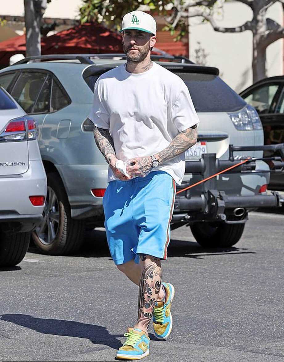 亞當李維當天頭戴洛杉磯道奇隊的棒球帽,搭配白色素T與水藍色短褲並腳踩NIKE的Dunk Low Premium SB 'Three Bears',這大概是很多人在熱天時會選擇的打扮,可是他穿的短褲可是GUCCI,水藍色跟腳上那雙Dunk隱隱有呼應的感覺。