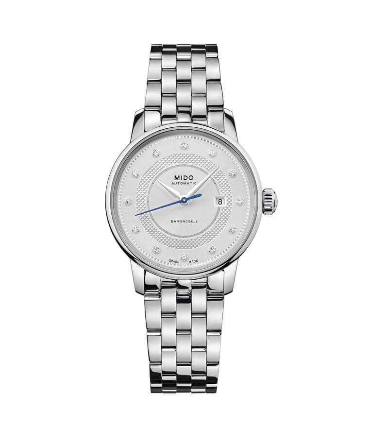 面盤上不同的飾面與拋光不鏽鋼錶殼形成視覺對比。美度表重塑腕錶的設計美學,將時尚與經典巧妙融合。男錶採用較大的39mm直徑,且由於錶圈和錶耳修改得較為纖細,其線條和直徑30mm的女錶一樣顯得精緻。雙面鍍防眩目塗層藍寶石玻璃錶鏡讓腕錶精美的線條更加流暢。