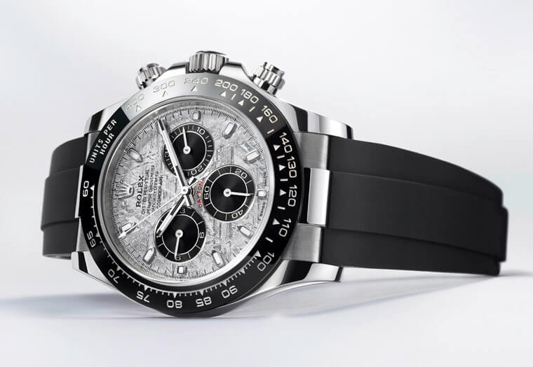 2021年啟用隕石面盤的Daytona共有三種款式,分別以白金、黃金和永恆玫瑰金製作錶殼,其中白金款比較特別一點,因為它的錶圈是黑色Cerachrom陶瓷材質,搭配的則是勞力士獨家的Oysterflex橡膠錶帶;相較於黃金和永恆玫瑰金則都是採用金屬錶圈搭配蠔式錶帶看起來的風格較為不同。