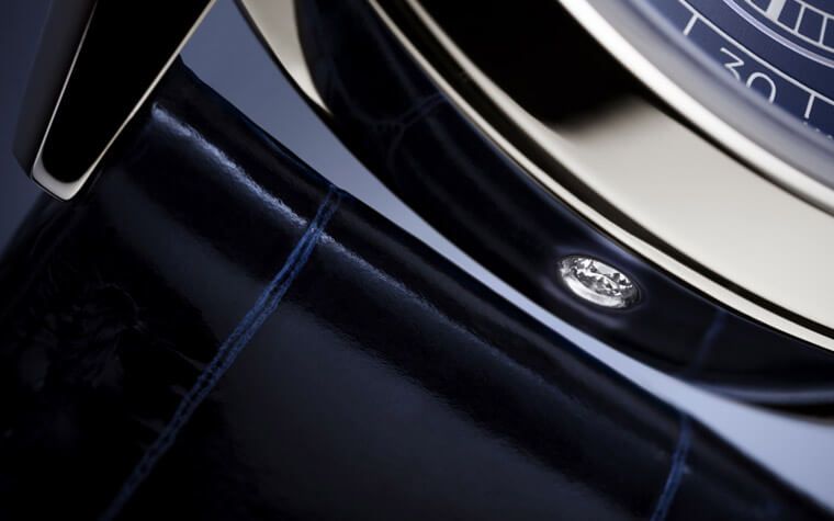 ▲5236P並列顯示萬年曆採用鉑金材質製作錶殼,6點方向鑲有一顆美鑽用以象徵其採用的高貴金屬。