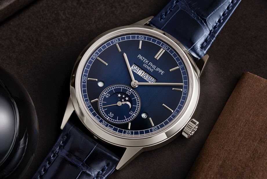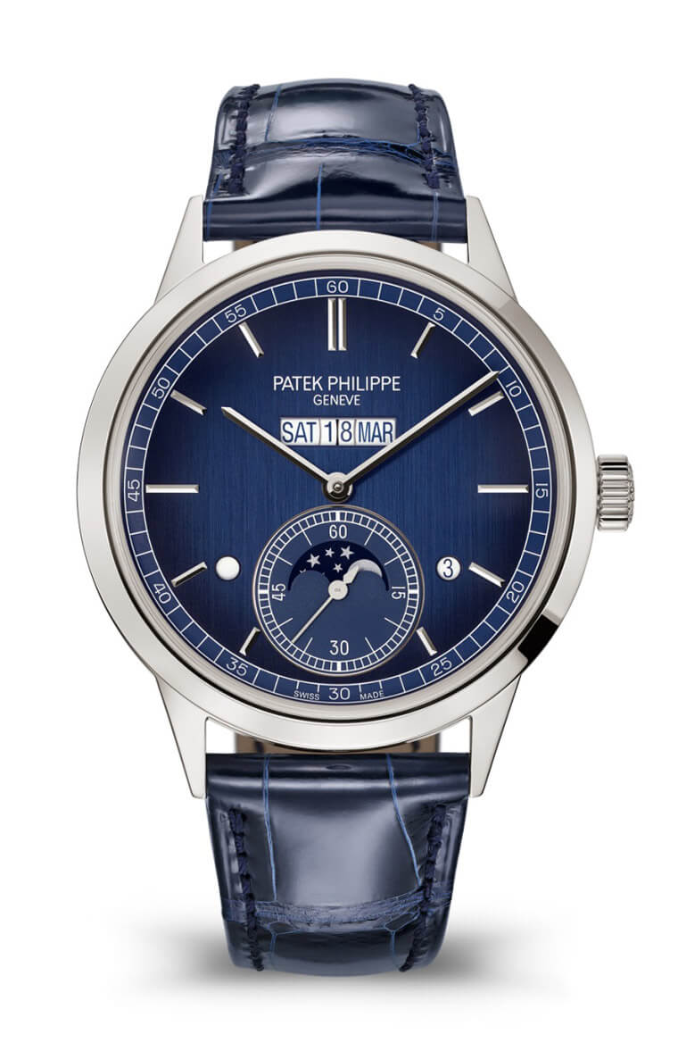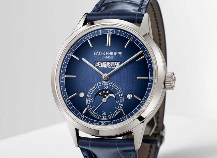 視線移到面盤上,這款錶採用藍色漸層面盤的設計近年在百達翡麗旗下也不會令人感到陌生,且品牌這次還在面盤加上垂直打磨,使它藍-黑的漸變色調看起來擁有更精緻且多變的層次。面盤以軌道式可度輔助佩戴者辨時,搭配立體鑲嵌白金多切面時標以及白金巴頓式指針等也都是PP行之有年的經典設計元素。