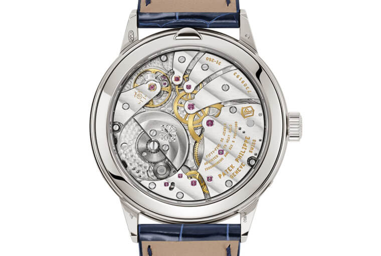 錶款透明底蓋下承載百達翡麗嶄新研發的31-260 PS QL自動機芯,這枚機芯採用微型自動盤設計有助於降低機芯厚度,同時其搭配的萬年曆模組亦擁有3項正在申請中的專利,包括透過四枚顯示盤運作的並列系統。別看手錶外觀簡潔且機芯厚度也只有5.8mm,但其實機芯共有多達503枚零件,從中可以想見品牌針對機芯的薄型化也費了一番功夫,這才使得手錶的複雜機芯結構不至於顯得厚實沉重,不只看起來清爽俐落,戴起來也相對纖薄舒適。
