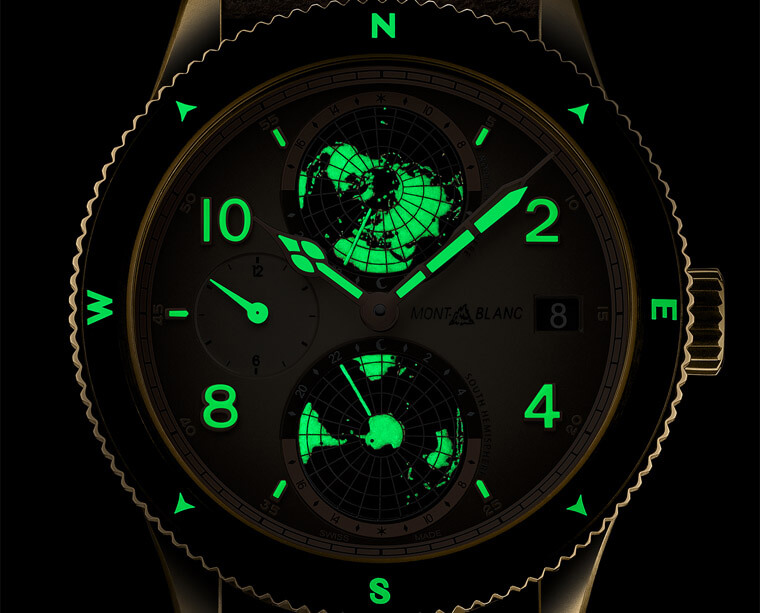 ▲萬寶龍在時標、刻度、指針以及南北半球球體等多處塗上Super-LumiNova®夜光物料,確保手錶在暗處的閱讀效果不受影響。