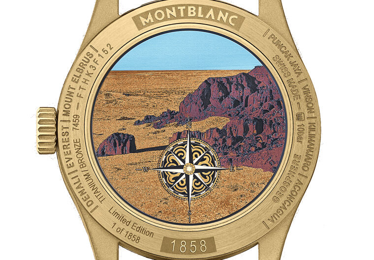 錶款還有另一個吸睛之處在於錶背圖案,這次萬寶龍採用特殊工藝在錶背放上猶如戈壁沙漠烈火危崖(Flaming Cliffs,又名「巴彥扎格」)照片的圖案,不過品牌當然不是在錶背鑲上照片如此簡單,而是先在鈦金屬錶背以雷射刻出烈火危崖的輪廓圖案,再於其上以霧面和拋光工藝交錯處理,再來就是運用雷射氧化技術幫錶背上的浮雕「上色」,另外萬寶龍還在錶背6點方向刻上羅盤圖案,並用源自蒙古飾品式的造型詮釋,濃濃的大漠風格帶給1858 Geosphere同中求異的個性。