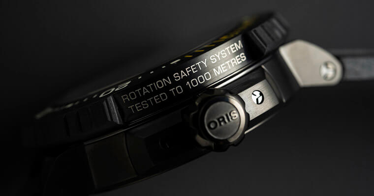 AquisPro Date Calibre 400擁有接近50mm的大尺寸錶殼,ORIS採用黑色DLC鈦金屬製作錶殼,使它佩戴時的負擔感能夠相對降低一些;錶圈方面用上了黑色陶瓷材質,它表面的刻度主要填上白色夜光物料,並另在前15分鐘刻度換成鮮豔的黃色,用意自然是提供佩戴者在水下環境時計算下潛時間。若從側面視角欣賞手錶會發現它的錶圈非常厚實,這是ORIS針對專業潛水員進行飽和潛水時所開發的獨家設計之一——錶圈旋轉安全系統(RSS),它的錶圈平常狀態下是鎖定的,因此幾乎不會產生所謂的誤觸情況,而當佩戴者需要計算下潛時間時,透過周圍包覆的橡膠外層可以牢牢握住錶圈,再按壓錶圈的同時往上提起,這時候才能進行單向旋轉錶圈的動作,而一旦佩戴者把手放開,錶圈又會處於鎖定狀態,讓人格外放心。
