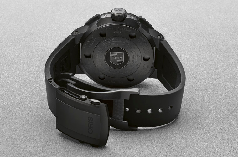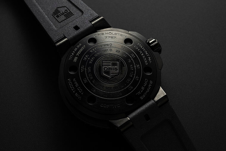 手錶面盤上擁有Aquis系列的招牌元素,包括時標、指針樣式等都與多數Aquis潛水錶如出一轍,ORIS並在黑色面盤上裝飾猶如海浪般的波浪紋以串連起手錶與海洋的印象。翻到錶背同樣是以DLC鍍上一層黑色的鈦金屬,品牌除了在此刻印Logo之外,還加上了英呎和公尺的換算刻度供佩戴者參考。