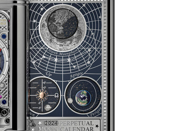 原本錶殼內部用來加上一些打磨裝飾的內面(第三面)如今也融入了和天文相關的複雜功能。第三面的上半部為周遭飾有經緯度的北半球夜空,此處中心是一枚經由雷射雕刻的月亮圖案,月亮圖案中央含有一枚藍色漆面圓盤,它會依照月齡的變化覆蓋雷射月亮圖案,展現出月亮的會合週期(也就是我們一般所說的月相顯示),錶款的月相顯示精準度特別高,每1111年才會出現一日誤差,意味下一次需要調整月相的時間已經是好幾代以後的事了。