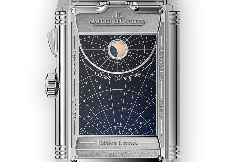 至於Reverso手錶通常錶殼背面(第四面)通常就是作為保護之用,頂多加上一些刻字或圖案增加視覺美感,但在這款錶上卻別開生面再放上與第三面有呼應關係的南半球月相,其以藍色漸變漆面示人,上面繪有經緯線以及星空圖案,僅在接近12點方向的地方設置較為傳統的圓形月相窗。手錶的月相功能通常都是以北半球為主,因此可以在一款錶上同時觀察到南、北半球月相的設計相對比較稀有。