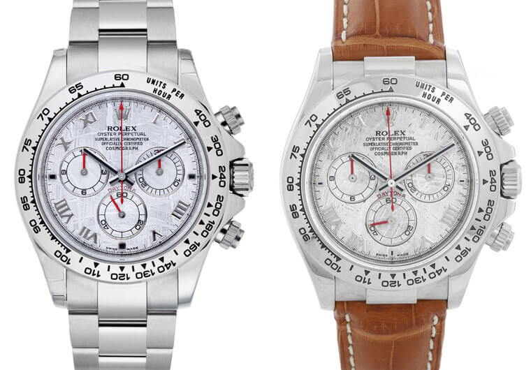 ▲勞力士在2003年最早推出的隕石面Daytona,當時兩款皆以白金材質製成,並搭配鍊帶或皮帶。Source:Christie、DeMesy Fine Watches & Jewelry