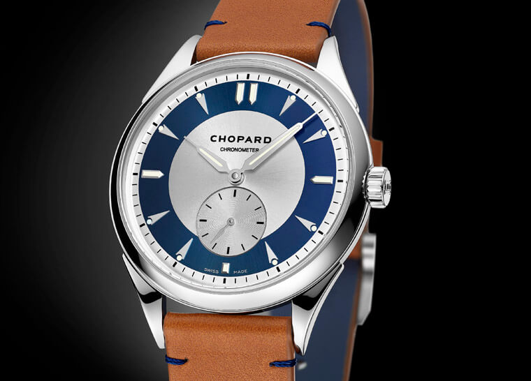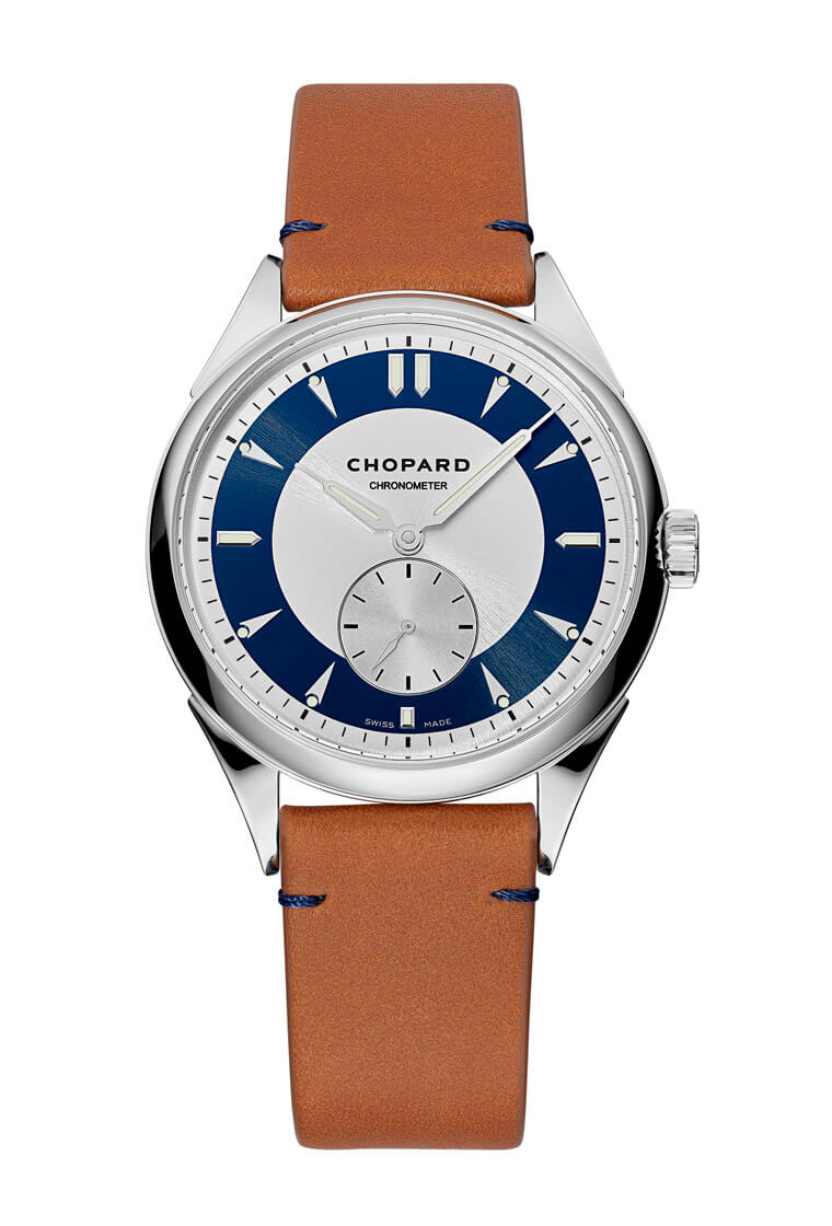 蕭邦為錶款搭配棕色小牛皮錶帶,同時還會再附上兩條與面盤顏色呼應的藍色錶帶,錶帶的頂級皮革來自採取負責任措施的供應商,天然的皮質隨著佩戴者汗水與時間作用,會出現獨特的色澤與紋理。