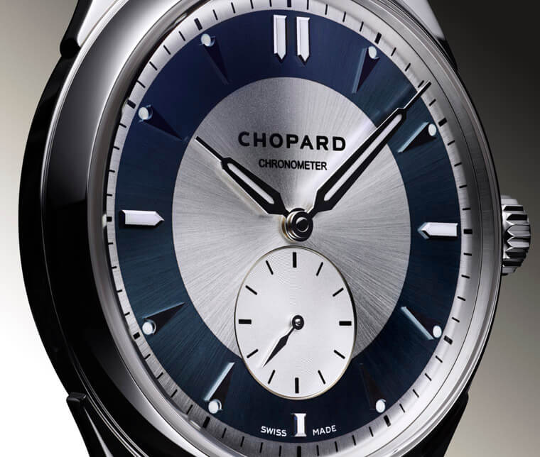 手錶的面盤具有經典的分區面盤設計,分區面盤風格最早於1930年代誕生,簡單來說就是面盤圍繞多個同心圓進行精心設計,L.U.C QF Jubilee面盤以銀色太陽紋為中心,中間圍繞一圈象徵蕭邦的藍色小時圈,時標的特殊幾何造型相當有辨識度,此外在面盤6點方向則有小秒盤,展現出時間的輕快節奏。而包括指針和時標上都塗有Super-Luminova® 超級夜光物料,確保手錶在暗處一樣看得一清二楚。