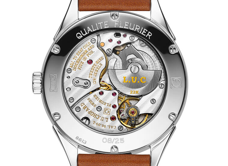 L.U.C QF Jubilee搭載蕭邦錶廠精製的L.U.C 96.09-L機芯,它採用22K金微型自動盤以降低機芯整體厚度,另外機芯具備品牌招牌的Twin技術和兩個疊加發條盒,使其能輸出65小時動能。機芯底板上是有日內瓦波紋,而細看底板上有一個Q字符號,從中可以看出機芯的品質非同一般。