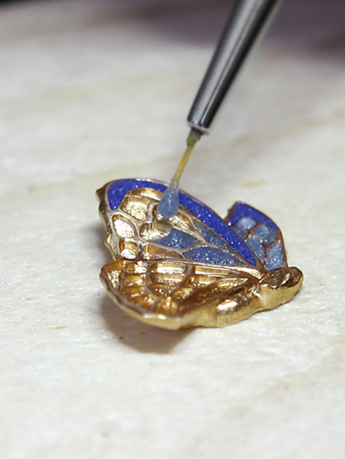 自然主義結合浪漫主義的詩意篇章,吟頌於雅克德羅時分小針盤(Petite Heure Minute)系列的純美錶盤上。為了製作這款獨一無二的手錶,雅克德羅工藝大師們無不施展絕技。先是精工雕刻,然後細膩繪製,還有首次出現的淺浮雕金飾,最後是錶盤大明火琺琅工序。複雜精妙的工藝讓錶盤圖案呈現出前所未有的立體美感。蝴蝶的觸腳則採用垂懸金線製作而成,伴隨手腕動作而輕微擺動。藝術錶盤包裹在43毫米直徑的18K黃金錶殼內,其自動擺陀清晰可見。"Only Watch"字樣鐫刻於錶底,標明其慈善意義。