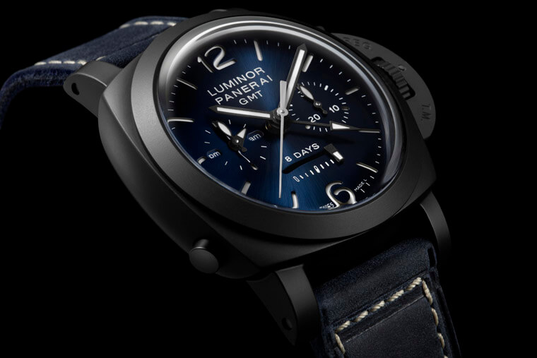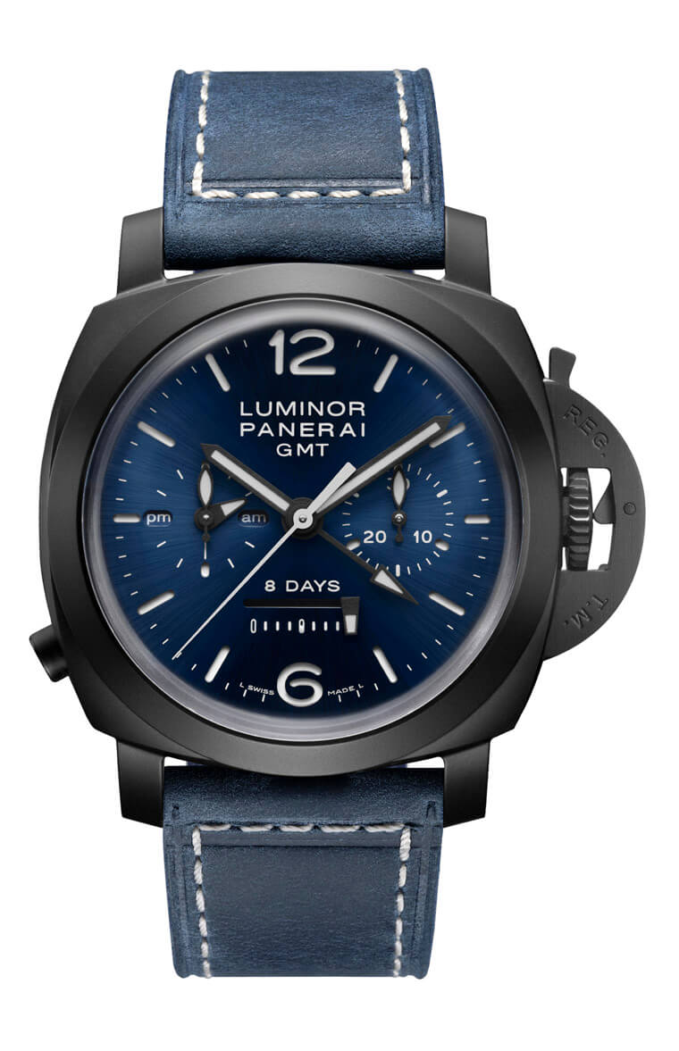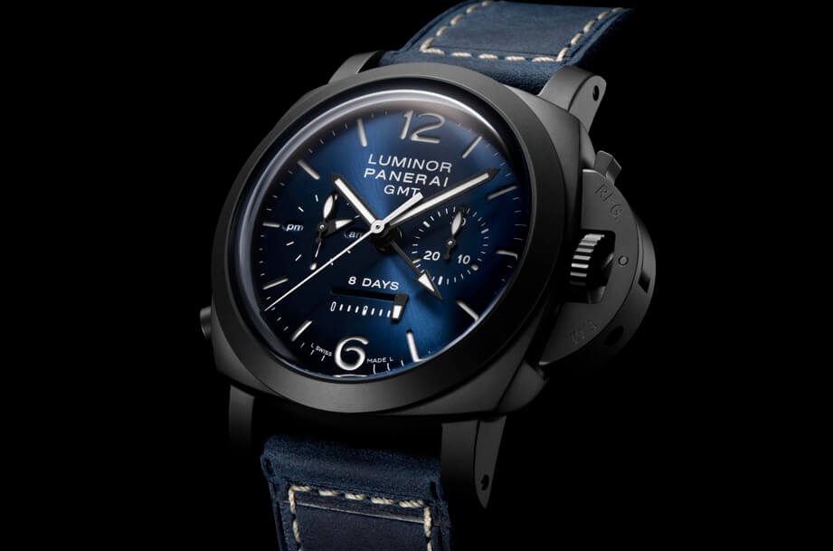▲面盤可見日夜顯示、小秒顯示與八日鍊動儲顯示、兩地時間功能等,但因為沛納海秉承著簡約的設計,因此儘管時間資訊繁複,但面盤仍然顯得俐落。