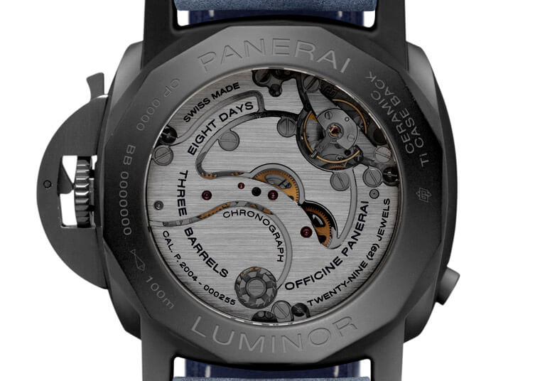 前面說了一堆,就是還沒說到這枚機芯是什麼型號,它便是品牌愛好者想必不陌生的P.2004手動上鍊機芯,這枚機芯是沛納海自主製作的第一款計時機芯。它可由單一按把操控計時功能,而這枚按把就位於手錶錶殼的8點鐘位置。P.2004共由321枚零件組成,結構相對複雜,且由於具備了3枚發條盒,使得機芯因此具有強大的八日鍊動能。翻到錶背可見沛納海採用黑色半透明底蓋,底下的P.2004機芯露出擒縱系統、導柱輪等機芯重要零件,另外底板的打磨一如沛納海的樸素風格,目前在品牌其他自製機芯中還是可以找到相近的設計風格。此外底蓋邊緣看起來也是全黑,但品牌於此同樣換上了DLC鈦金屬材質,而非與錶殼一致的陶瓷材質,目的與錶扣一樣,鈦金屬更理想的親膚性是品牌使用異材質組合的主要考量。