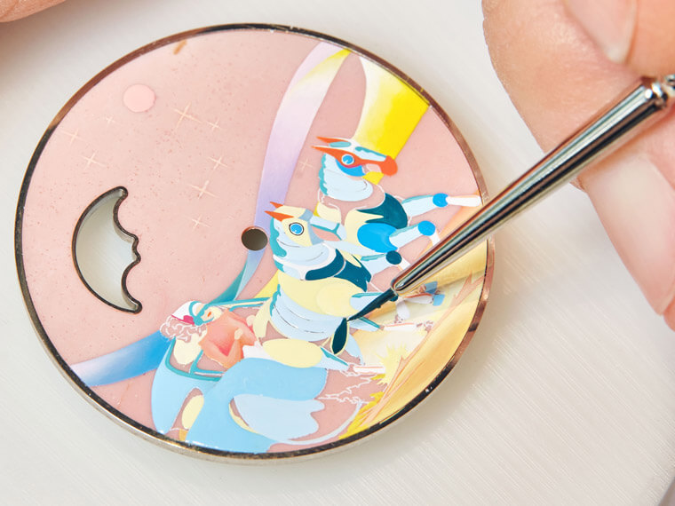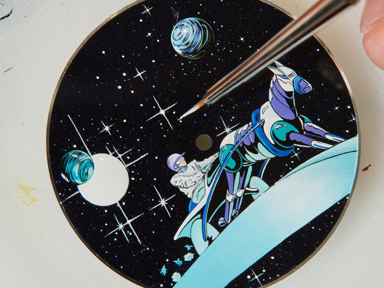 男款以白金材質製成,面盤上的圖案為一位男性騎士駕駛一匹駿馬,砂金石材質替畫面營造出置身星空的聯想,而除了騎士與駿馬之外,微繪師還精心加上其他星球為畫面增添張力。至於女錶同樣以白金材質打造錶殼,不過手錶面盤換成了色調溫潤的粉紅蛋白石鋪陳奇幻的宇宙場景,畫面中的騎士換成了一位女士,她在未來感的馬車上拉著兩匹快馬,微繪師甚至連快馬踩在地上揚起的煙塵都刻畫到位,