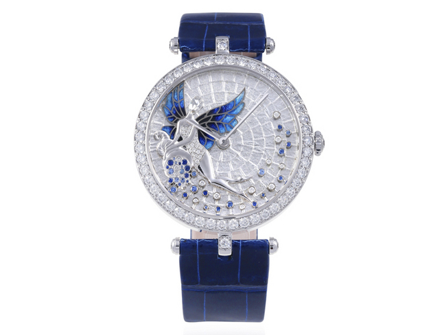 VAN CLEEF & ARPELS梵克雅寶於2012年首次採用的微砌馬賽克琺瑯技術亦被應用於此手錶。錶盤底層置上的金屬閃片”paillon”,為半透明的琺瑯更添層次與光芒。此技術令白金鋪鑲鑽石的錶殼更為輕盈,同時亦具動感。鑽石與藍寶石閃亮交織,賦予手錶生命。承接世家經典的仙子形態,白金打造的Fortuna以微型雕刻,一顆玫瑰形切割的美鑽化為其臉孔,翅膀則由鏤空琺瑯(plique-à-jour)工藝所製。