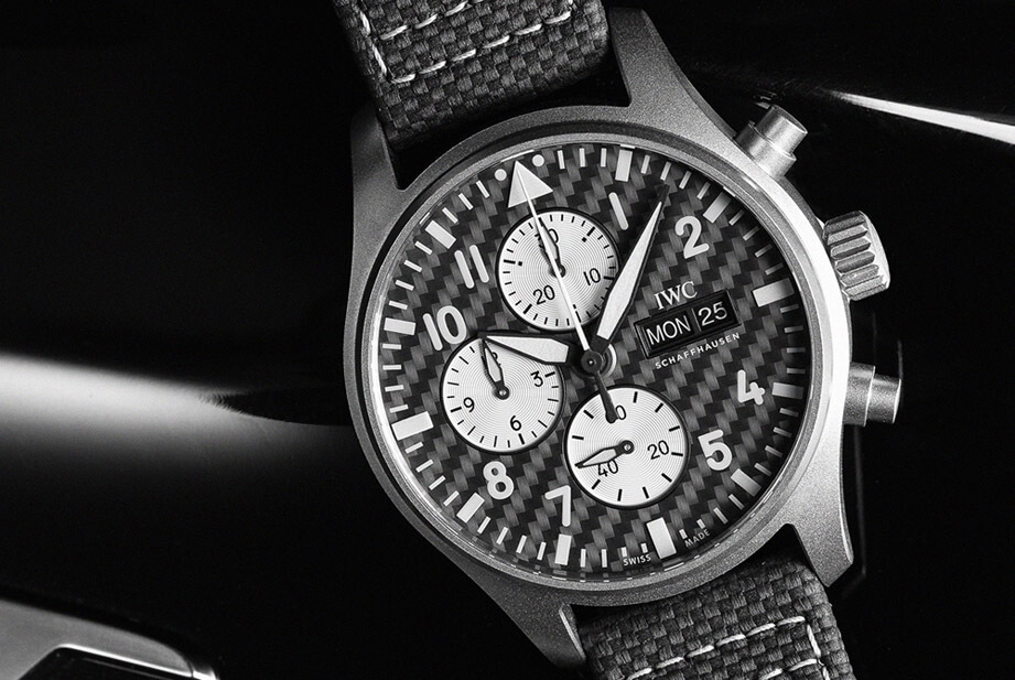 而IW377903的面盤格局跟其他飛行員系列計時碼錶大致雷同,不過品牌為了要彰顯和跑車世界的聯名主題,因此也特別以編織碳纖維製作面盤,這些碳纖維素材的來源正是Mercedes-AMG,這種面盤材質的原始物料即為碳纖維,經過品牌運用紡織機加工為織物結構,使最終成品呈現出經典又有辨識度的編織外觀。IWC因應碳纖維面盤而配置銀色計時小錶盤,乍看之下還有一種跑車儀表那種似曾相識的感覺。