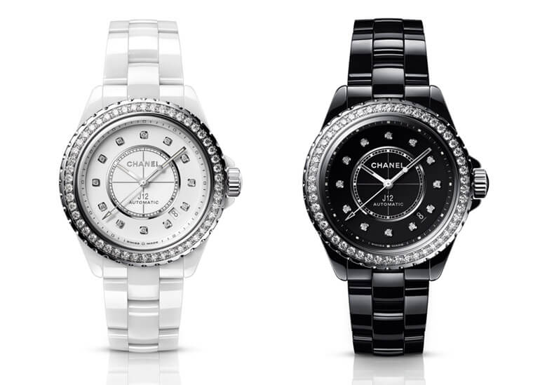 此外J12系列除了陶瓷材質外,香奈兒過往也經常替其點綴鑽石裝飾,2021年新款J12鑲鑽腕錶分別推出白色與黑色抗磨精密陶瓷版本,錶款秉承前兩年全新改款的J12設計,例如錶圈的凹槽從30個增加至40個、陶瓷錶冠的寬度減少三分之一、透過更為圓潤及柔化的側面線條,使得實際上增厚的錶殼看起來依舊玲瓏有致。此次香奈兒新增的鑲鑽款式均以50顆總重約1.51克拉明亮式切割鑽石鑲嵌錶圈及12顆總重約0.09克拉的鑽石詮釋時標,賦予原本低調優雅的黑白色陶瓷錶殼更為耀眼動人的視覺魅力。